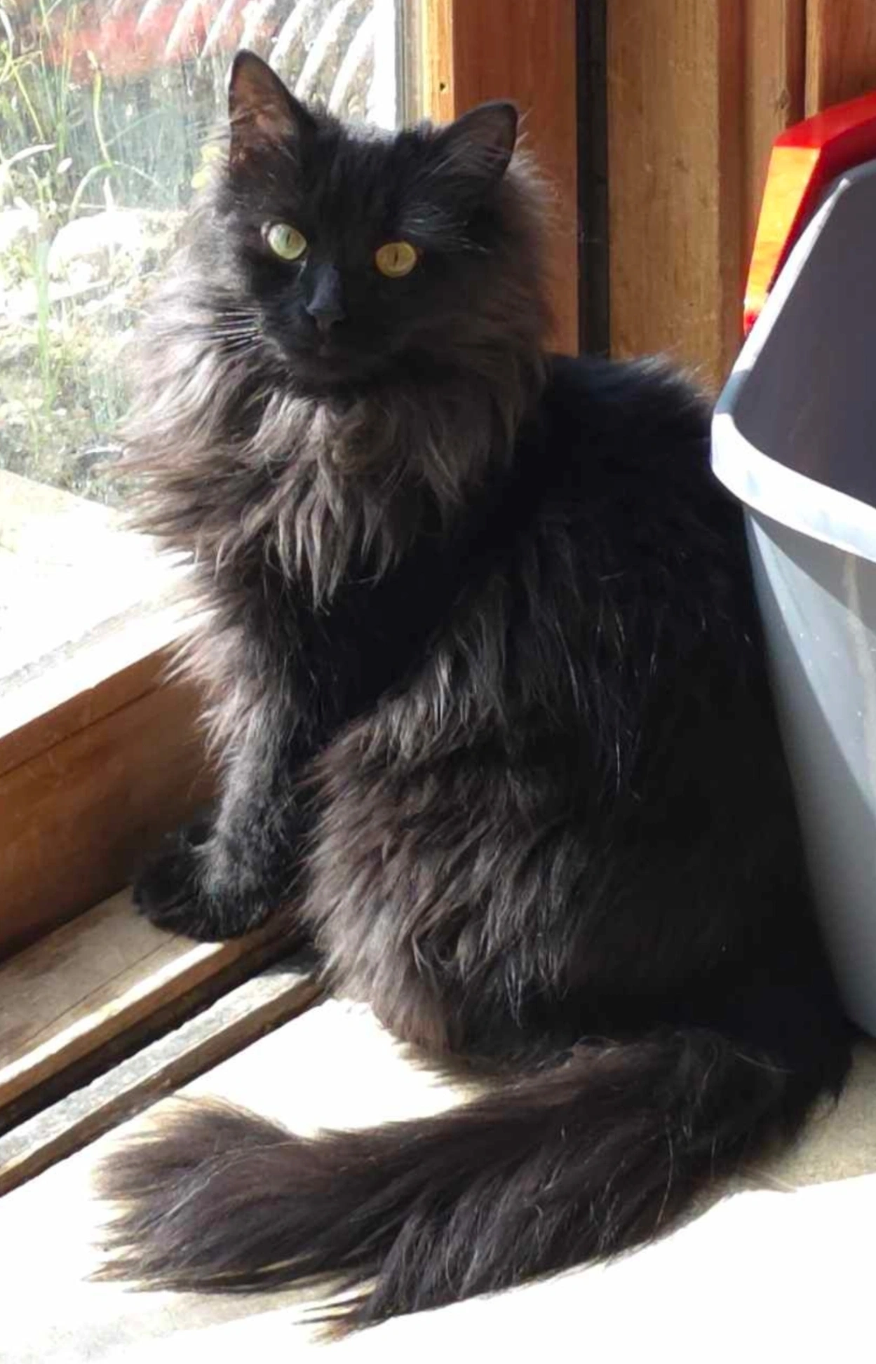 Long black hair, green eyes, about 6-8 pounds. Skittish but sweet, loves wet food