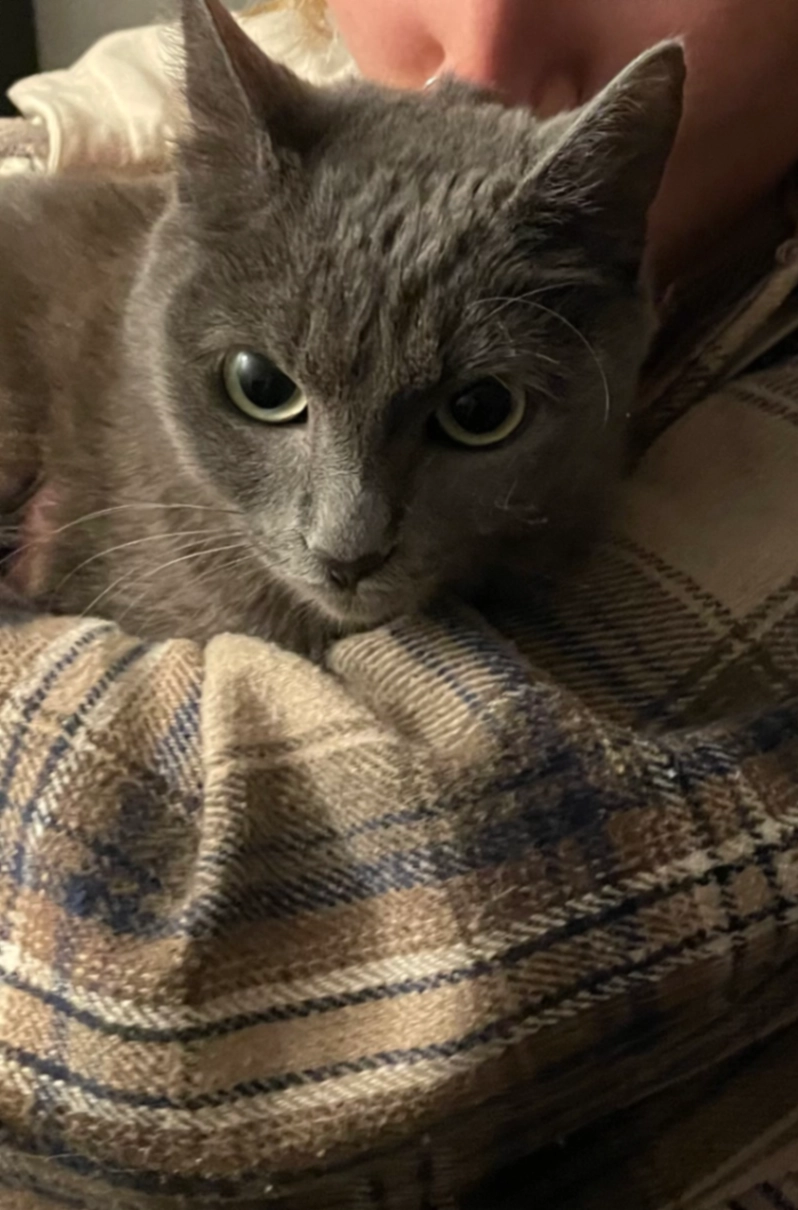 Fluffy grey and white. Microchipped. We food motivated.