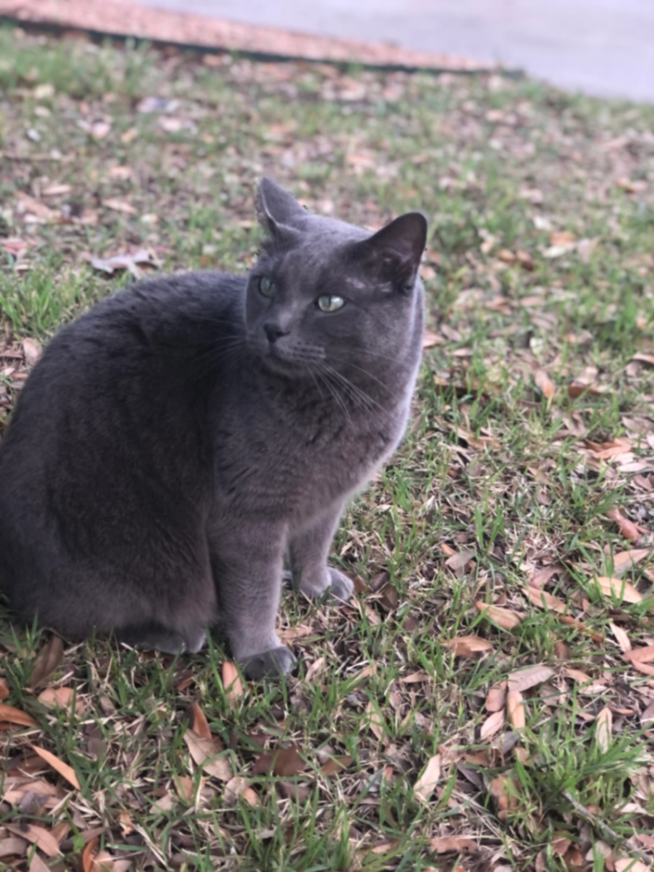 He is all gray with a white spot on the bottom of his stomach. He ran out this time without his collar on. He has green eyes, very sweet, but shy at first, he doesn’t have a mean bone in his body.