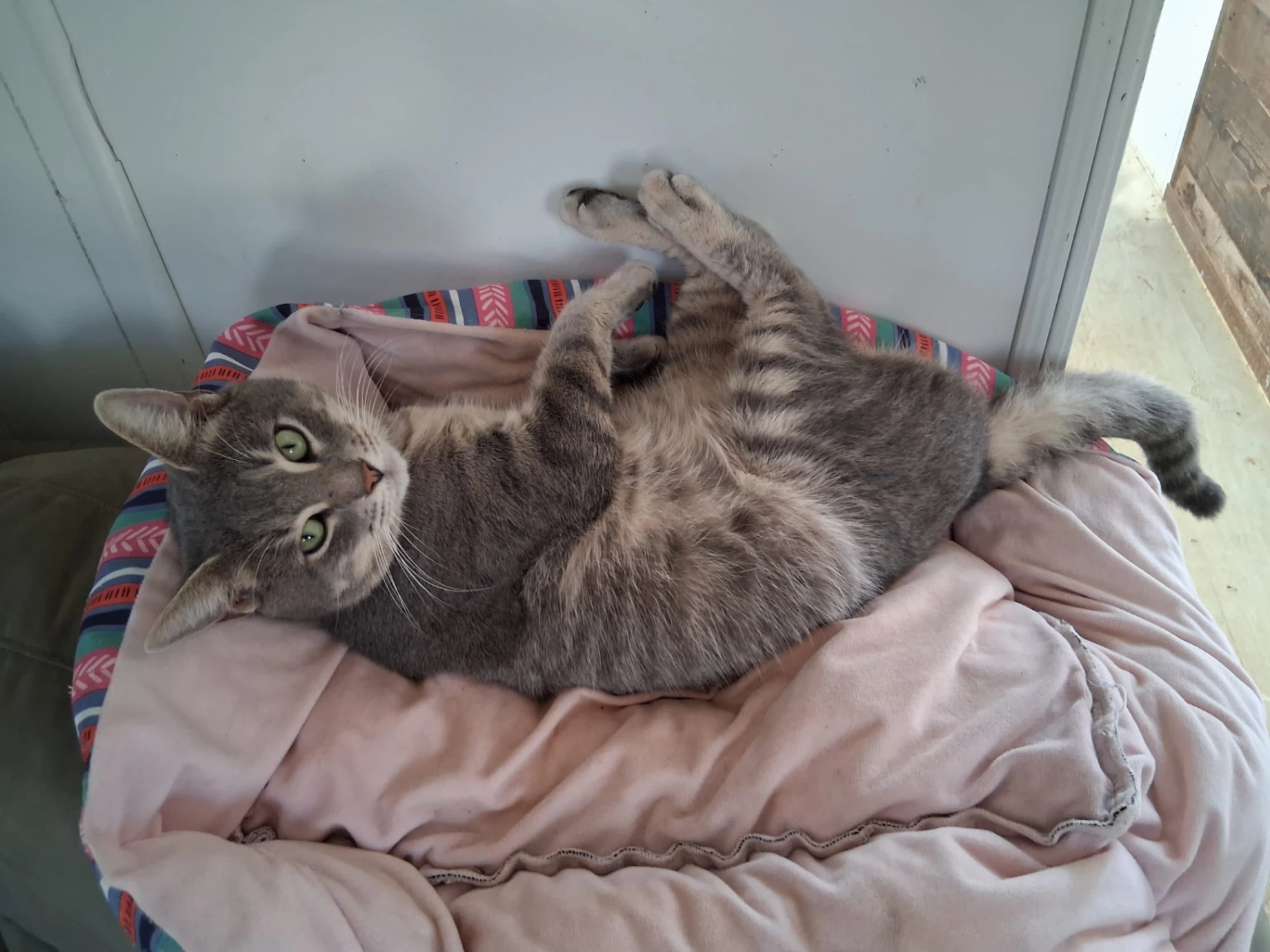 Older shy grey cat with tipped ear (not feral) and white muzzle.