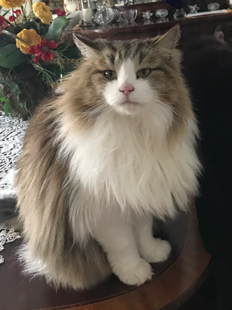 Very friendly long haired mixed breed cat. Mixed brown black cape with white underbelly face and paws.