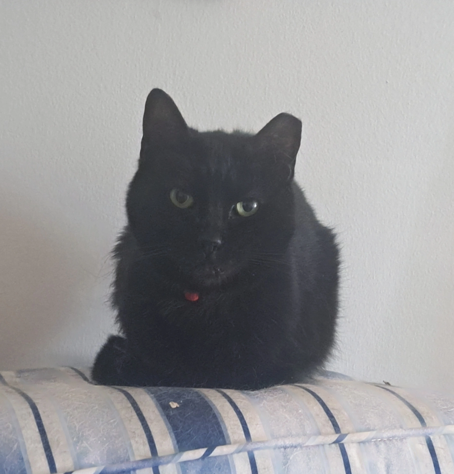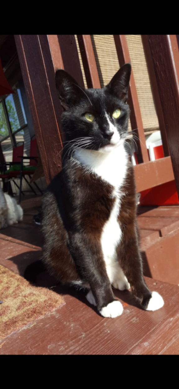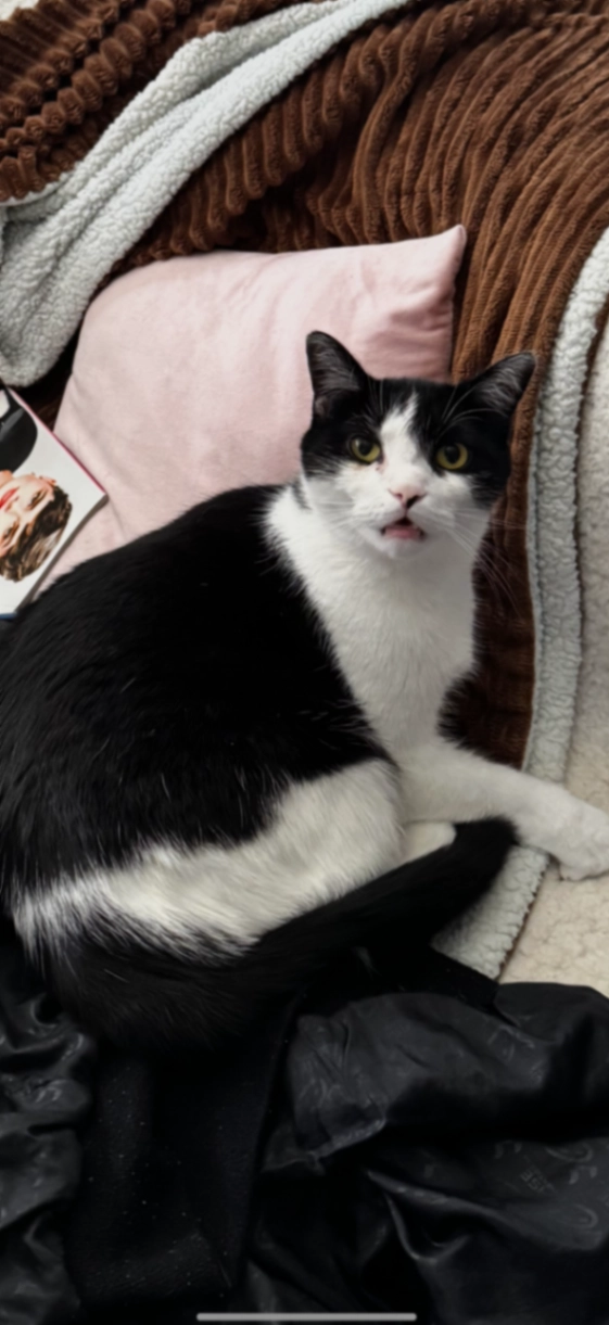 Binx is a senior, 16-17 year old tuxedo cat. She has a white spot on her nose going up the bridge, large yellow eyes, she was a larger cat when she went missing, which was the weekend of March 24, 2024. She has white booties and whiskers. She is skittish, anxious, and slow moving. She oscillates between really sweet to aggressive if she gets anxious.