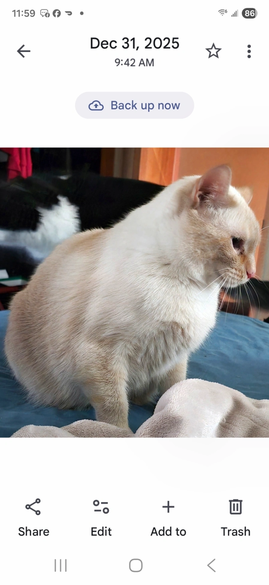 Sunny is 10 years old, slim, green eyes, has a black spot on his gums. Normally very sweet and vocal.