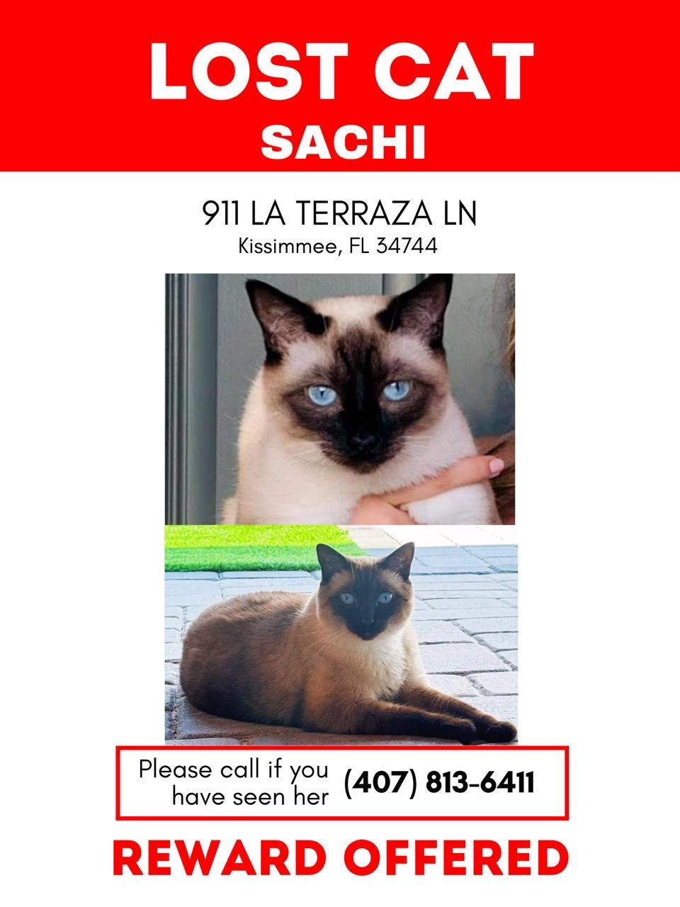¿Has visto a Sachi? Revisa en tu garaje, ático, cobertizo y espacios exteriores.