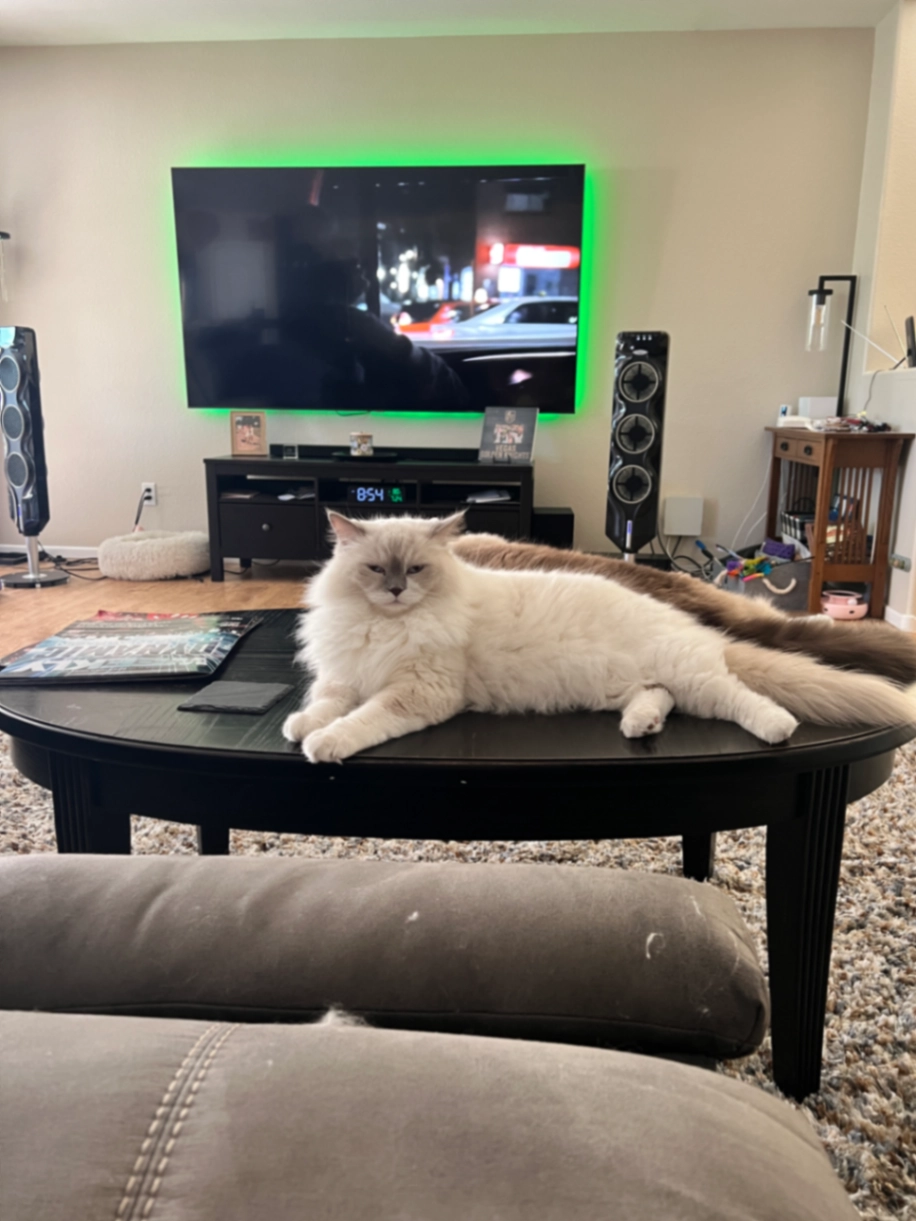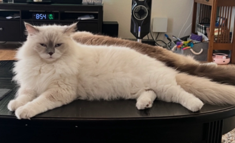 Long haired white ragdoll cat named Cabo. 4 years old. Blue eyes. Indoor only. Chipped. He is my world. Husband left the back door open.
