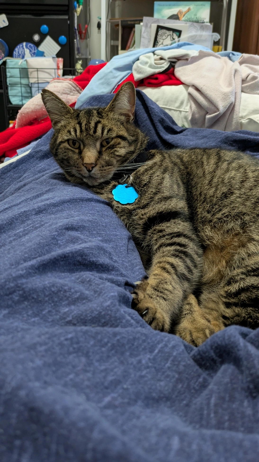 Large dark gray tabby. Shy. Quiet and well behaved, neutered male