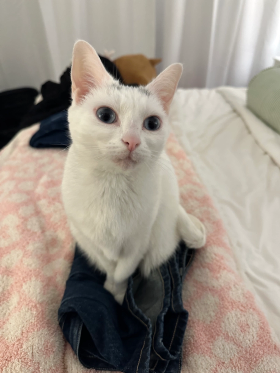 Blue eyes, all white with gray patch on top of her head, very timid and scared of loud noises