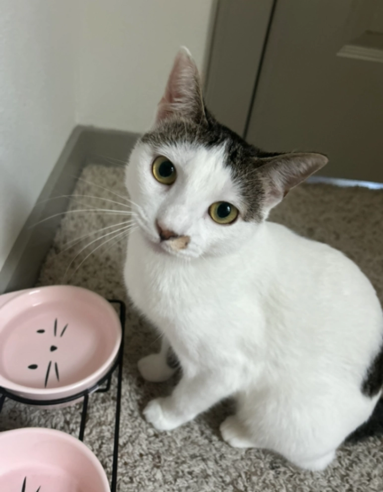 Betty is a tuxedo cat with green eyes. Very distinct heart shape on the top of her head along with the shape of an elephant head on her side.