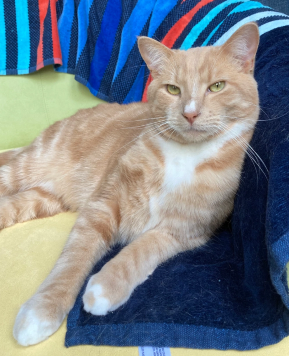 Orange shorthair with white chest. Big cat, 14 lbs