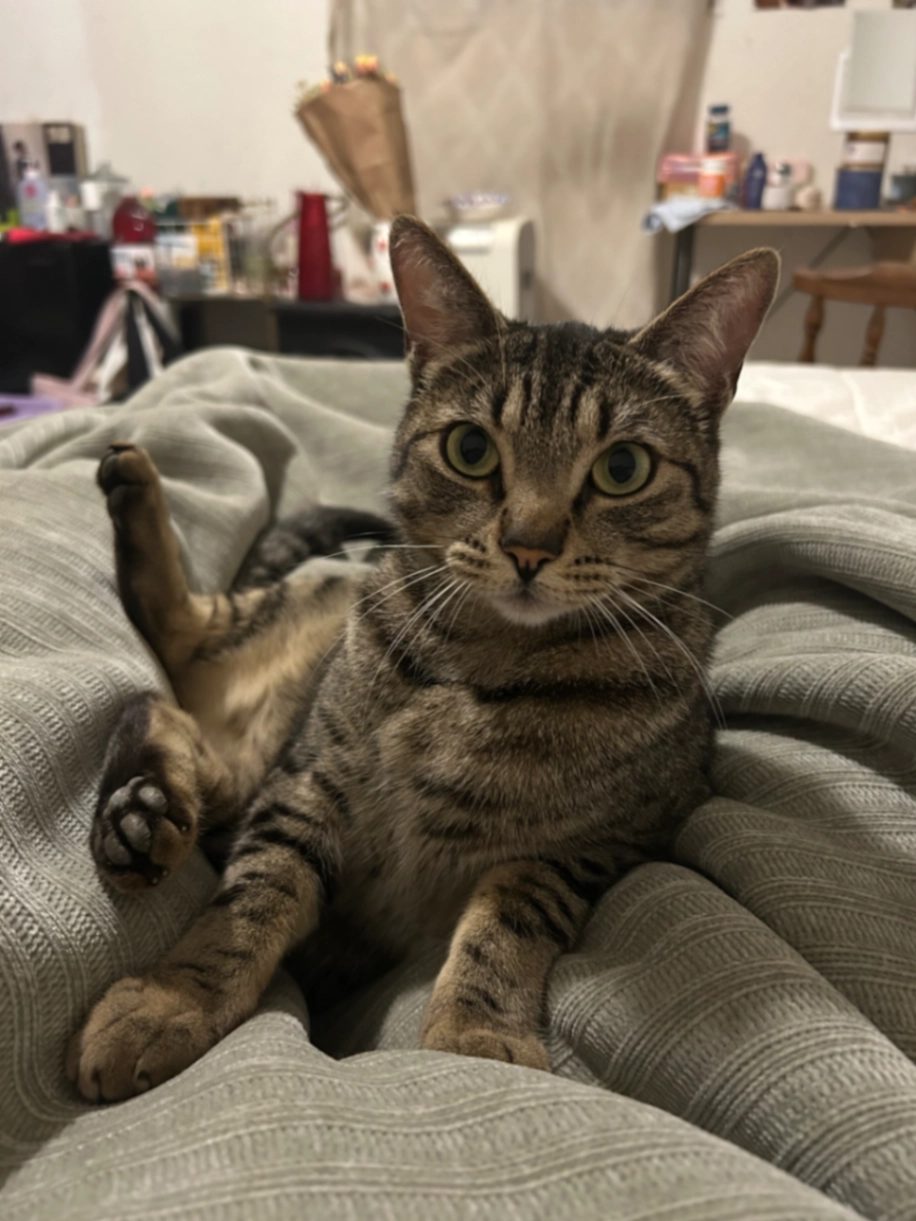 Male tabby with white on his back toes. Indoor cat so he is probably scared.