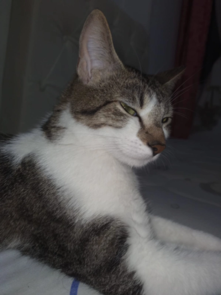 Bunny has a thick coat of black fur and a little larger than the average cat. Bunny has a deviated septum so when he meows it sounds more like a meh than a meow.