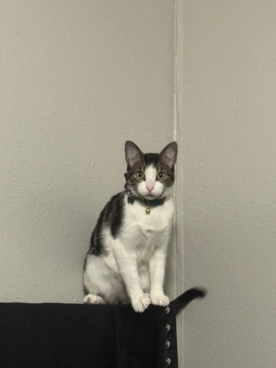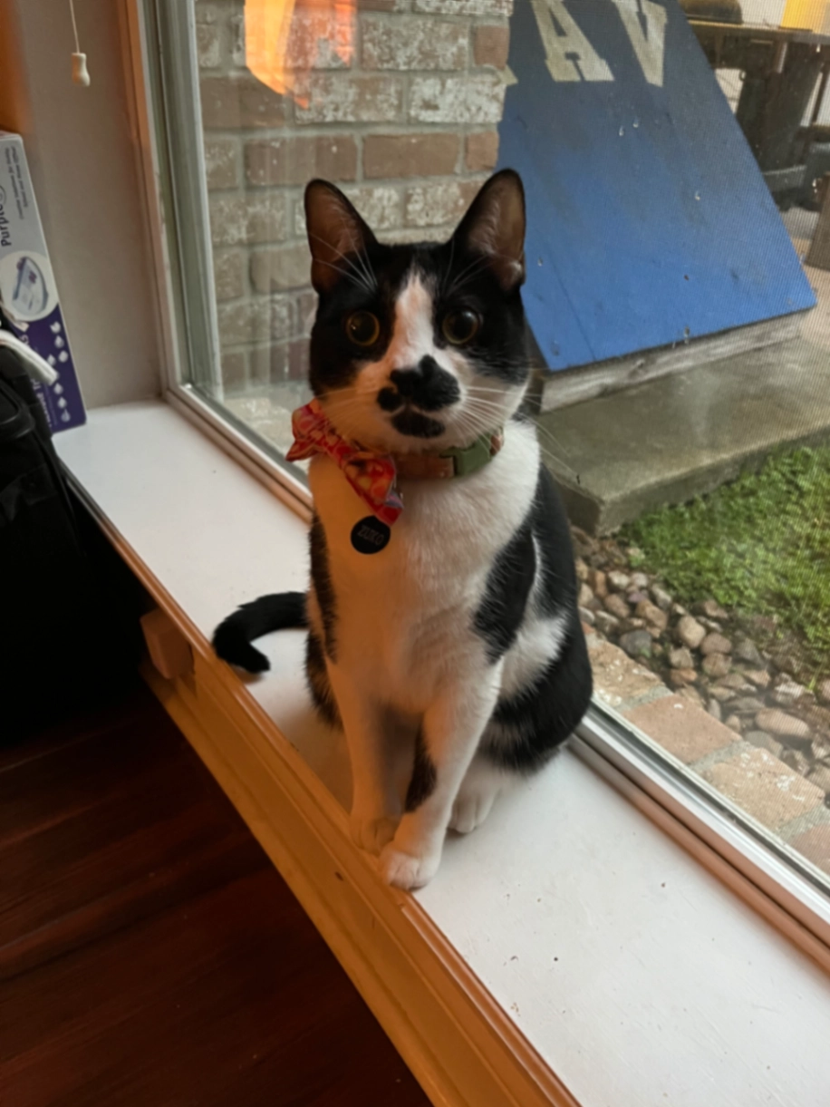 Black and white tuxedo last seen wearing an orange collar with gold name tag and pink bow tie