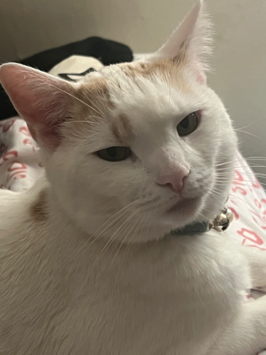 Joku is ginger-patched white, large in size and is wearing a green collar with contact phone number