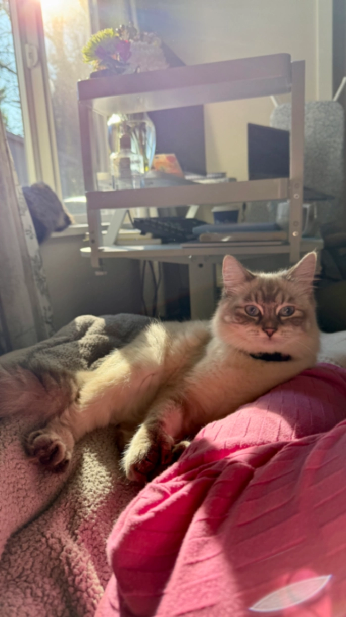 Lino Lada is a light-colored white cat with grey areas (ears, nose, tail, paws) with extremely blue eyes, and was wearing a burgundy leather collar with her name and our phone number, along with a small bell.