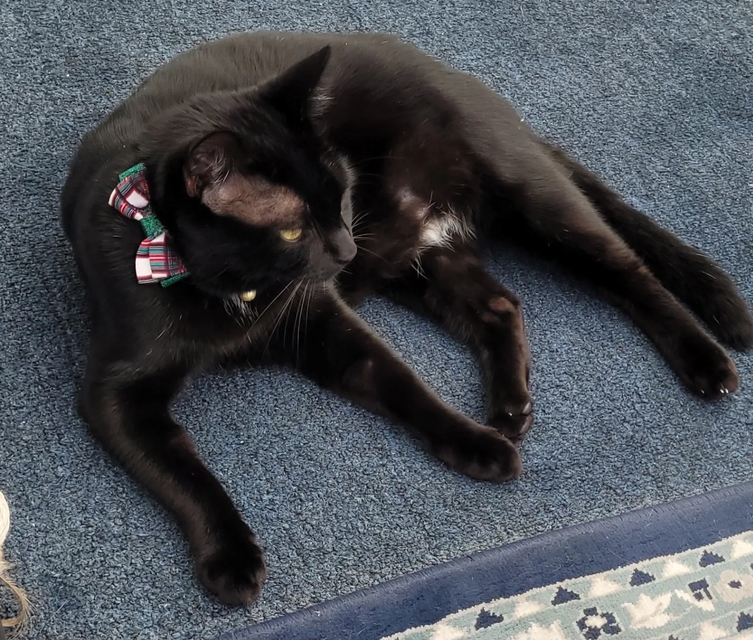 All black with bare tummy. Friendly but very shy.