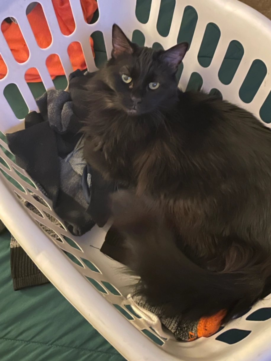 Black short haired cat with green eyes. Very sweet. He has the TINIEST speck of white on his back between his shoulders. Its maybe 3 hairs.
