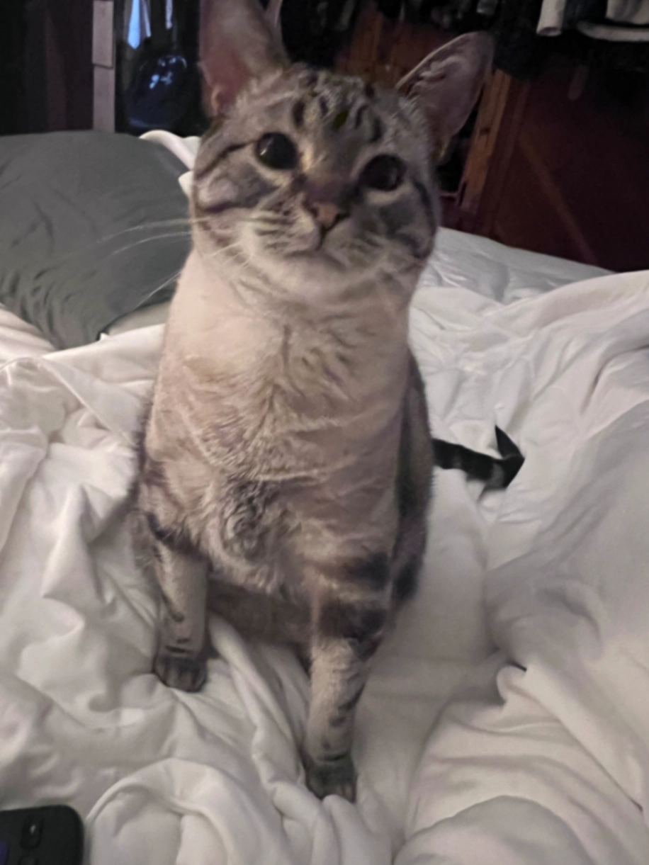 Bunny is a 7 year old lynx point Siamese cat. He’s white with grey markings and very blue eyes. He’s shy and not too social but he’s very loving. He is not microchipped.