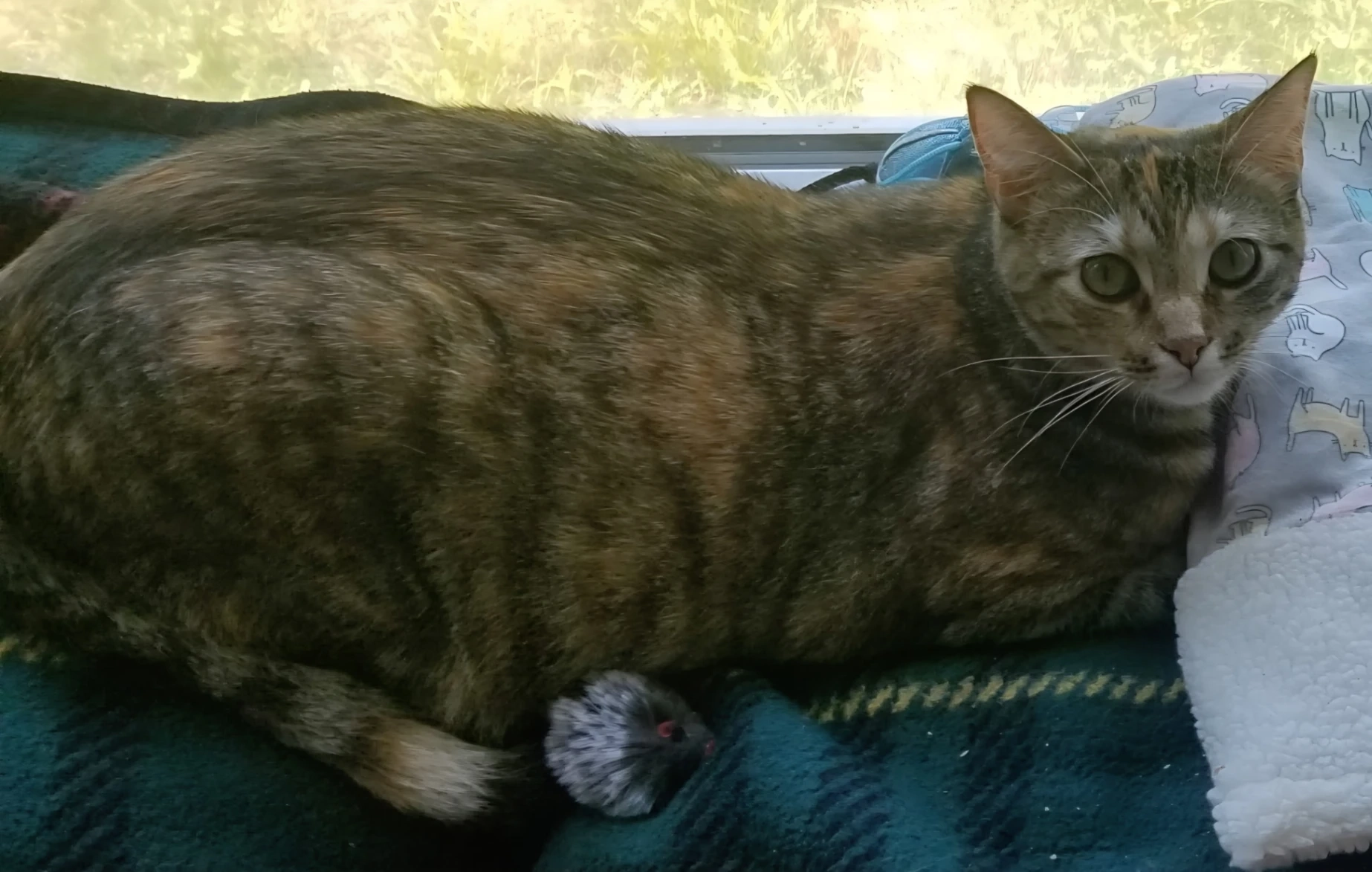 Tabby female. Indoor cat. No collar. Kinda chunky.