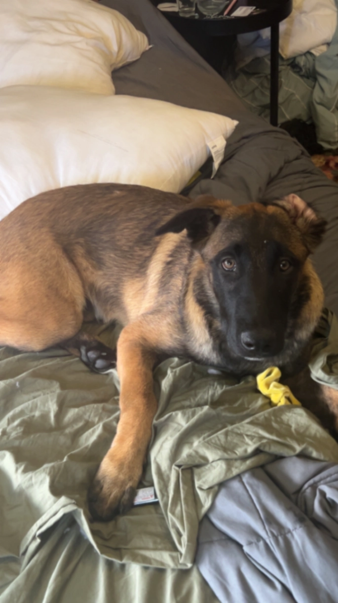 Friendly to people and animals but likely very anxious and scared since he’s not normally away from home. May run off if approached. Dark face, red and black body. Belgian Shepherd X, 16 months old microchipped