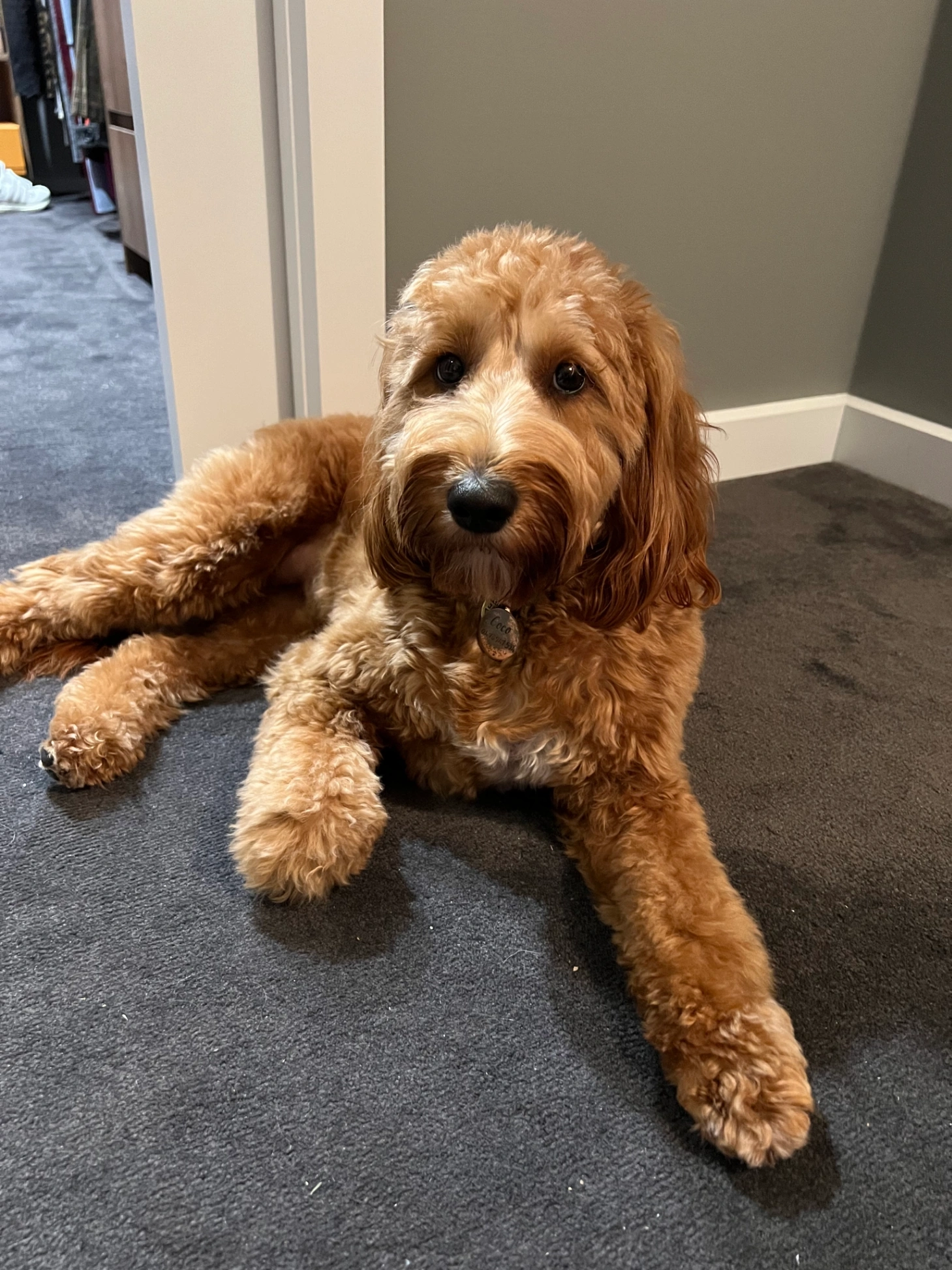 Mini Groodle Apricot in colour - Coco - she has a pink collar on with strawberries on it.