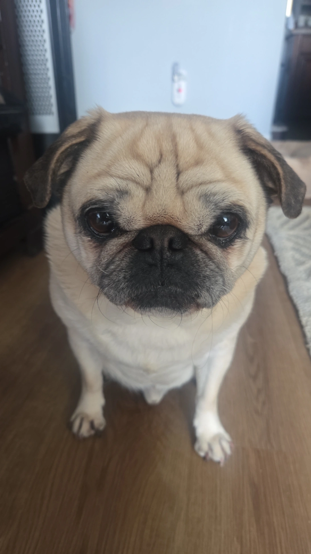 She’s a shepherd mix. With dark fur, blonde feet and a white dog on her nose
