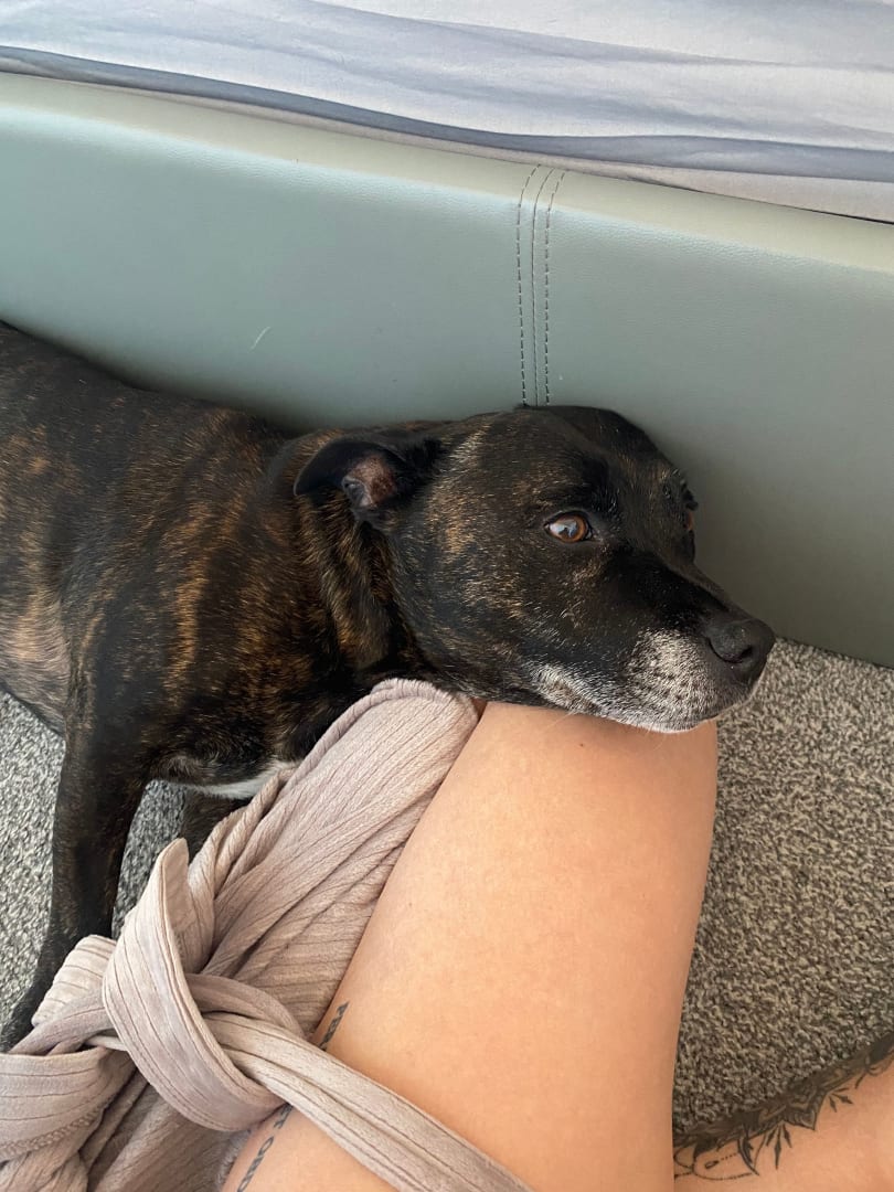 10 year old male Staffy. Black / brown / brindle. Very friendly to humans, but grumpy with dogs. No collar as escaped from the garden. Chipped to an address in Haslemere I believe (ex partner)
