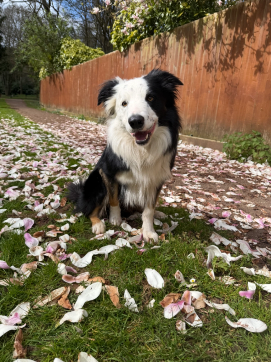 Large collie, running scared as got zapped from the electric fencing. Will be very scared but if you find him give him a ball and he should stay with you. No collar on but is microchipped.