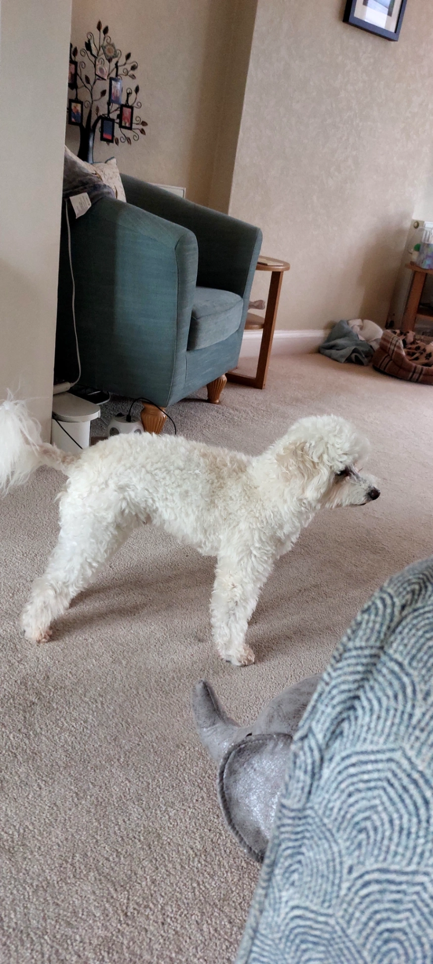 Very small Pomeranian who has no lead on. Very nervous dog and tends to wonder around when outside.