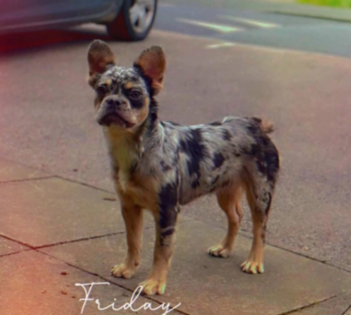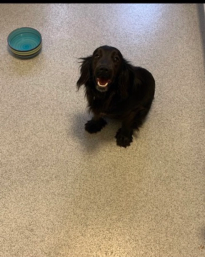 She’s a friendly dog, all black with bit of white on her chest. She’s heavily pregnant so really worried about her