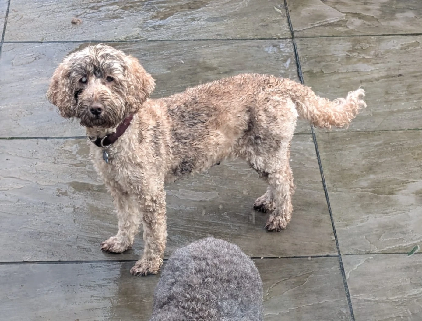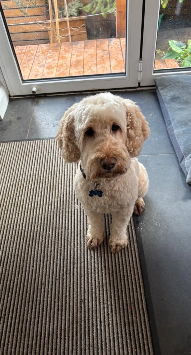Blond 8 year old Cockerpoo. Rescued just a few months ago and very loved. Nervous but very friendly. So if you see her be calm, call her name and tempt with treats if available.