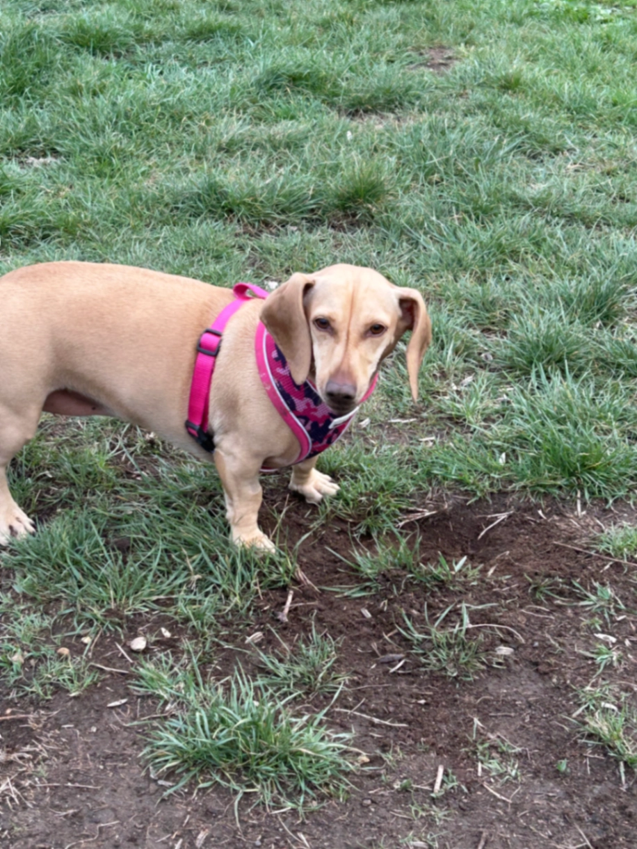 Sandy coloured. Daschund/ jack russel cross. Wearing a pink harness