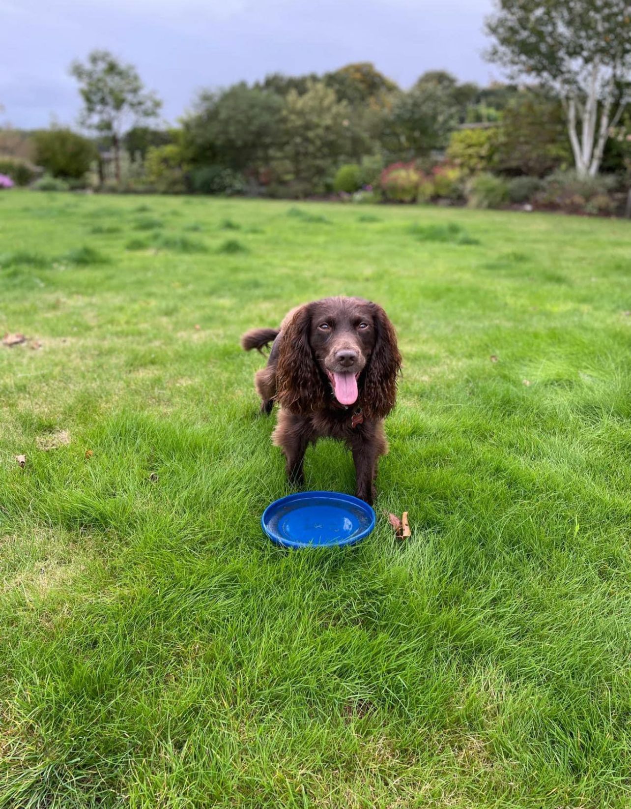 Brown sprocker spaniel, microchipped, has no collar on. Is a very noisy but timid dog and barks a lot