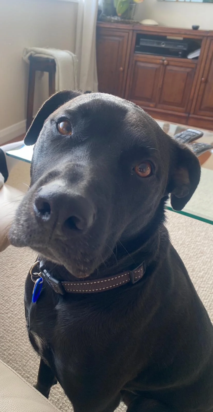 He is not wearing his collar and has 2 big brown spots on his face where his eyes are he has 2 black nails on his back toes he's quite big but short and medium fur and his ears are down he has small brown spots on his body