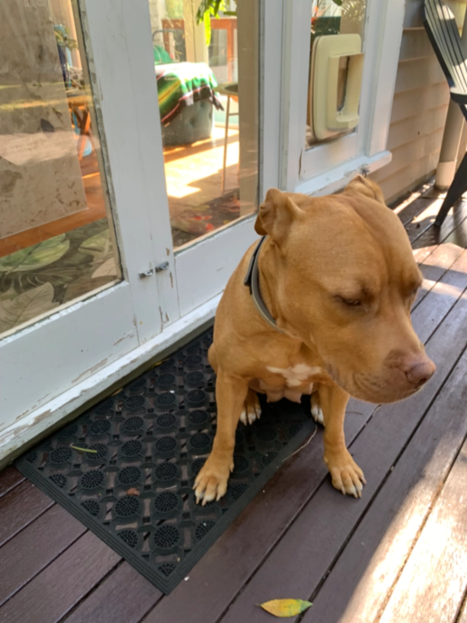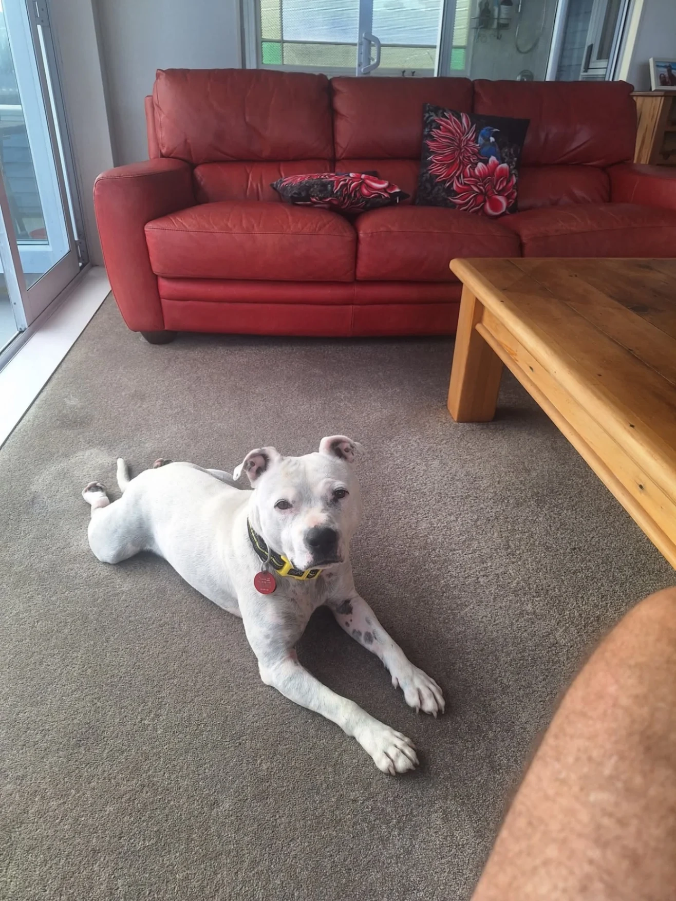 Staffy bitch, maybe 3-4 years. Has council tags. Very friendly and obedient