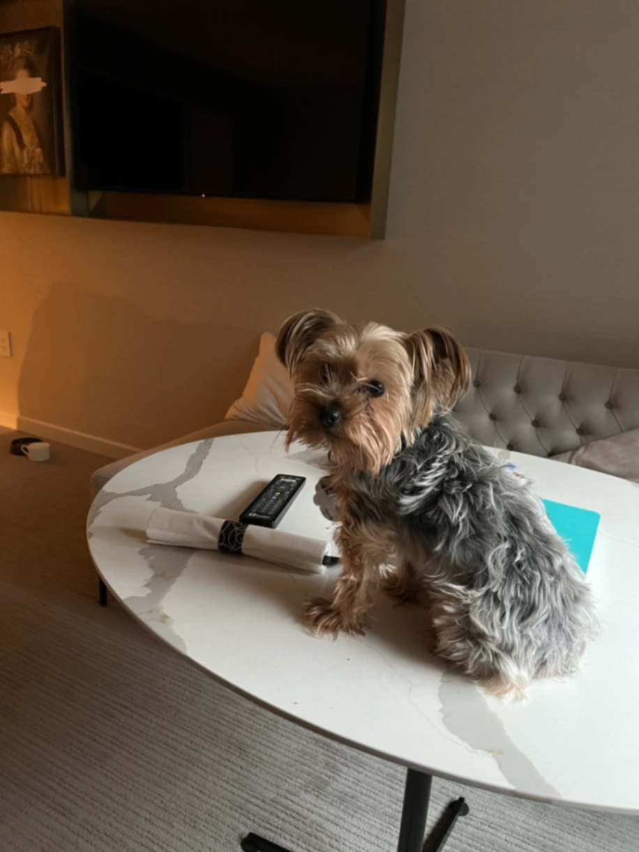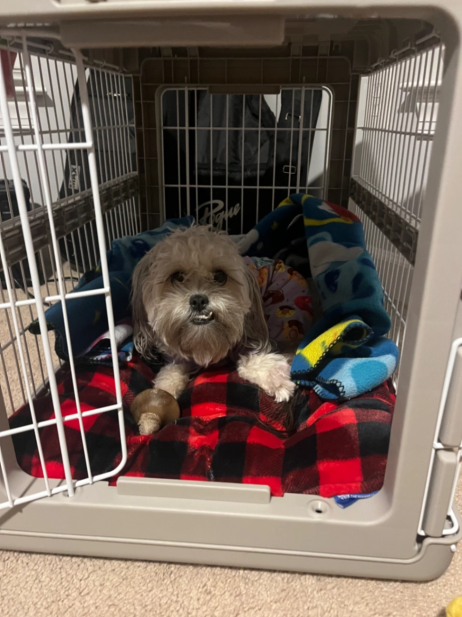 Mixed breed Maltipoo and Shih Tzu, 10 pounds, cream color coat with black and grey, long tail and ears, fading pink dye on front paws