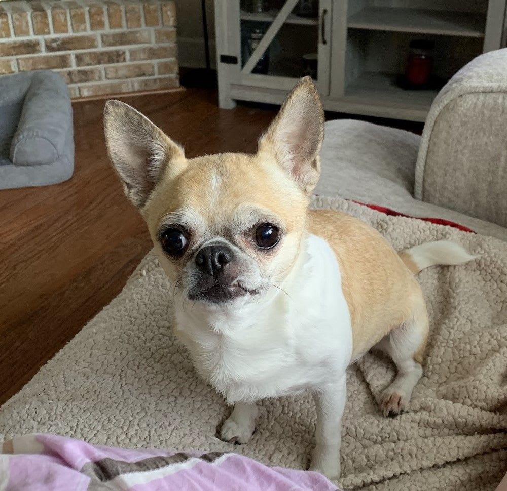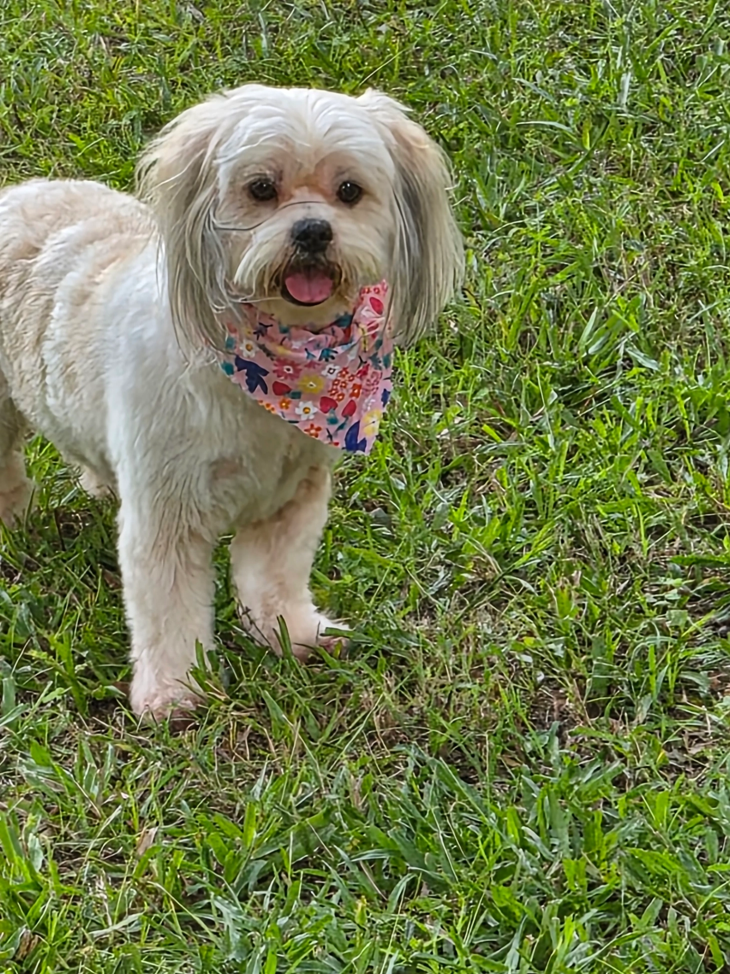 Light tan body and back, white chest and stomach, back of the ears are a light gray, bottom canine gets stuck on her top lip. Very friendly, but skittish around strangers. Loves squeaky toys and treats. My phone number is 704-620-2182, email is [email protected]