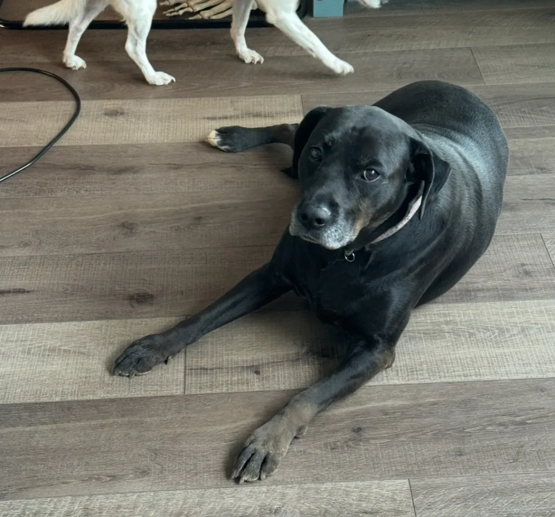 She is a black lab/boxer with a gray snout. She is normally a love bug. She is chipped and her name is Minnie. She is sometimes timid to men. Usually not women. She is usually motivated with food. She is allergic to chicken. This is the first time in her 5 years that she has ever gotten out. I am sure she is very scared. She is my son's unofficial therapy dog. We got her when we thought my son may not walk again. She hates when they are apart.