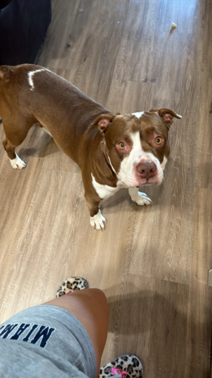 Brown and white Australian Shepard about 55 pounds- friendly but very skittish