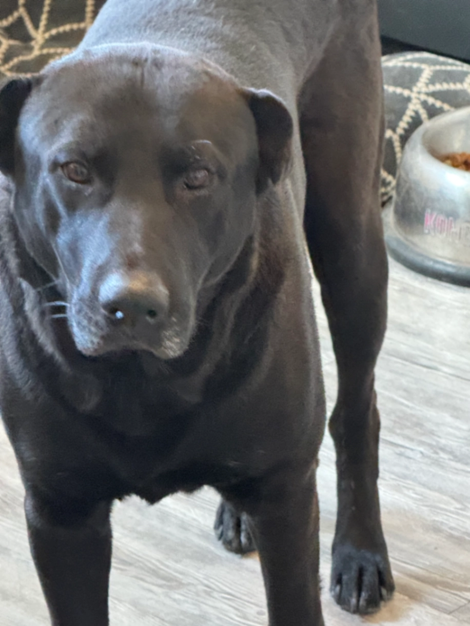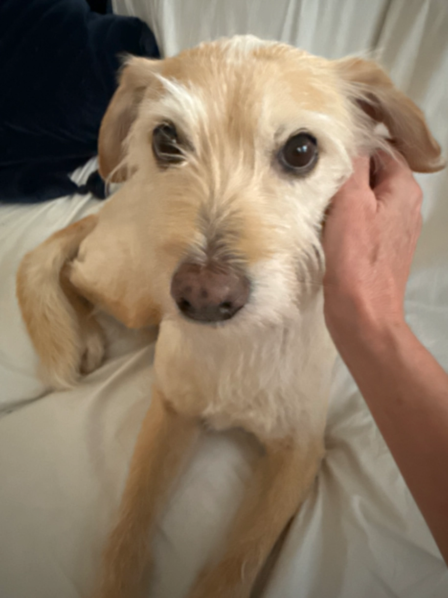 Lola is a short, chunky, tan pit-mix. She has a white patch on her chest. She was wearing and blue and green collar with her name and contact info. She is a bit skiddish and unlikely to approach.