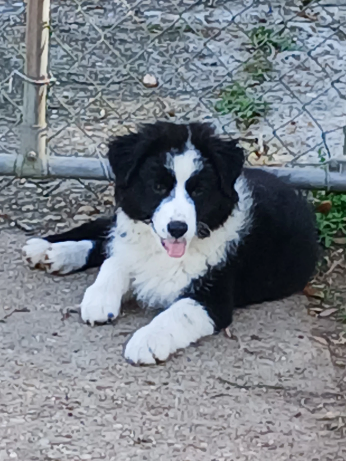She's a black and white Australian shepherd with a docked tail. She's very timid, so my might be skittish around people but she is very sweet and very loving and is very much a people person and want to be in people's laps. She does not have a caller, probably.And she is not microchipped.