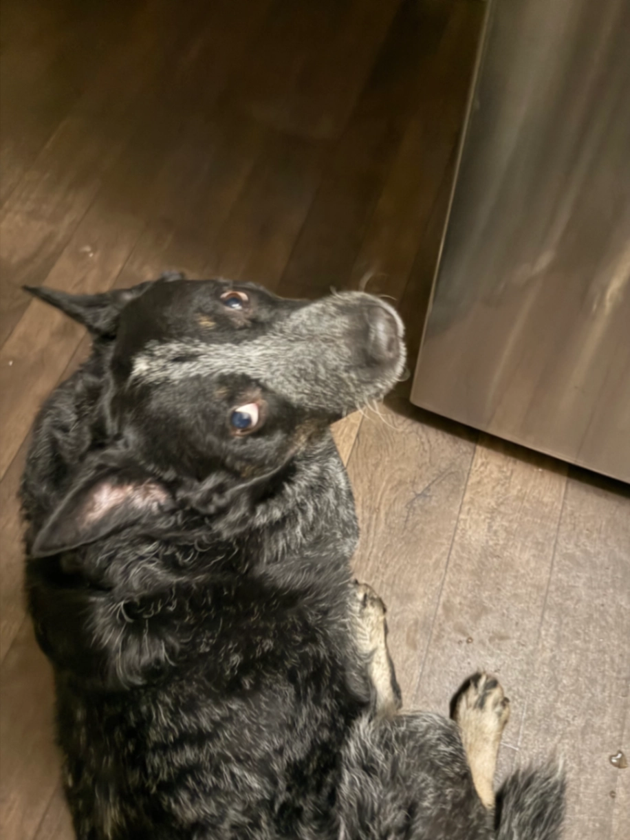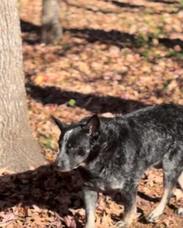 Blue Heeler- salt pepper fur- medium size. Sweet and shy