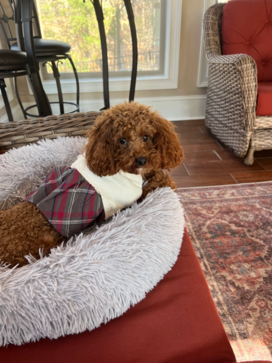 Red toy poodle last see wearing a blue jean dress. 6 pounds