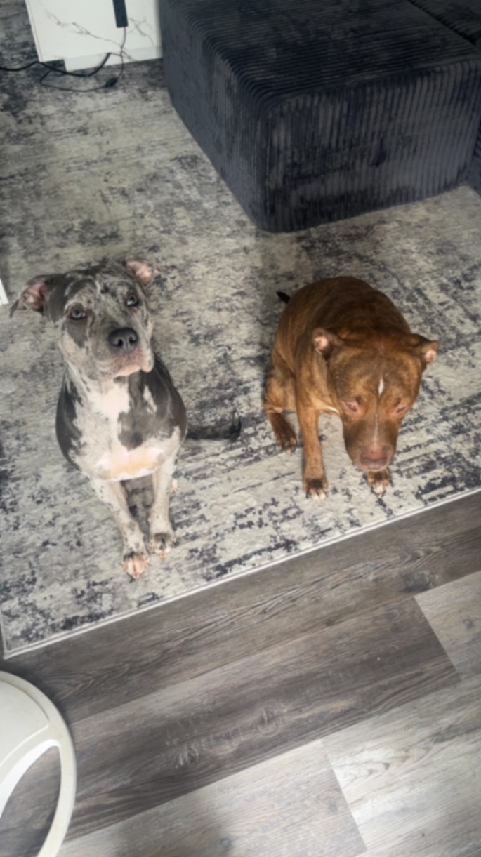 White and grey American bully with a heart shape on her head