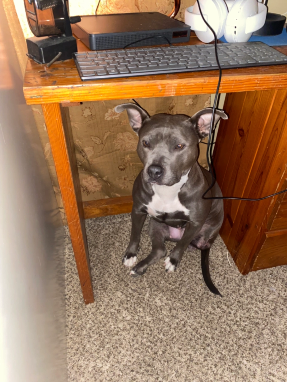 She’s grey pitbull has 3 legs missing the back left leg, she’s very friendly last seen in a black harness