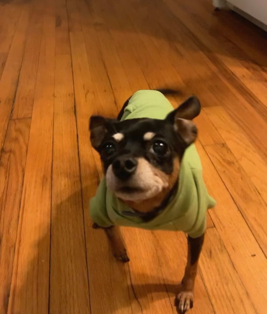 11year old tan Miniature Pinscher - black with tan markings (graying on snout) 4.5lbs- has bad knees (knee dysplasia) visible when walking and can’t walk for extended periods. She is chipped but no collar or tags on her at the time she escaped my yard