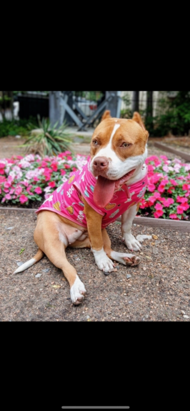 White and tan docile Pitbull. Her owner is desperately looking for her. Contact 2148611037