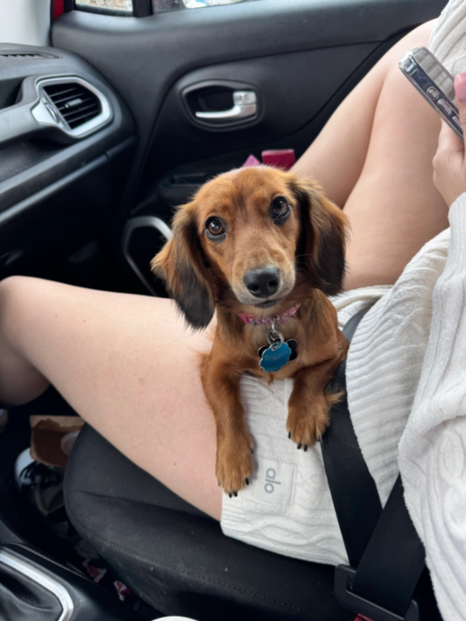 Winnie is a 9lb miniature dachshund. Reddish brown coat with black markings on ears and sides of back. Brown eyes. Very sweet and affectionate.