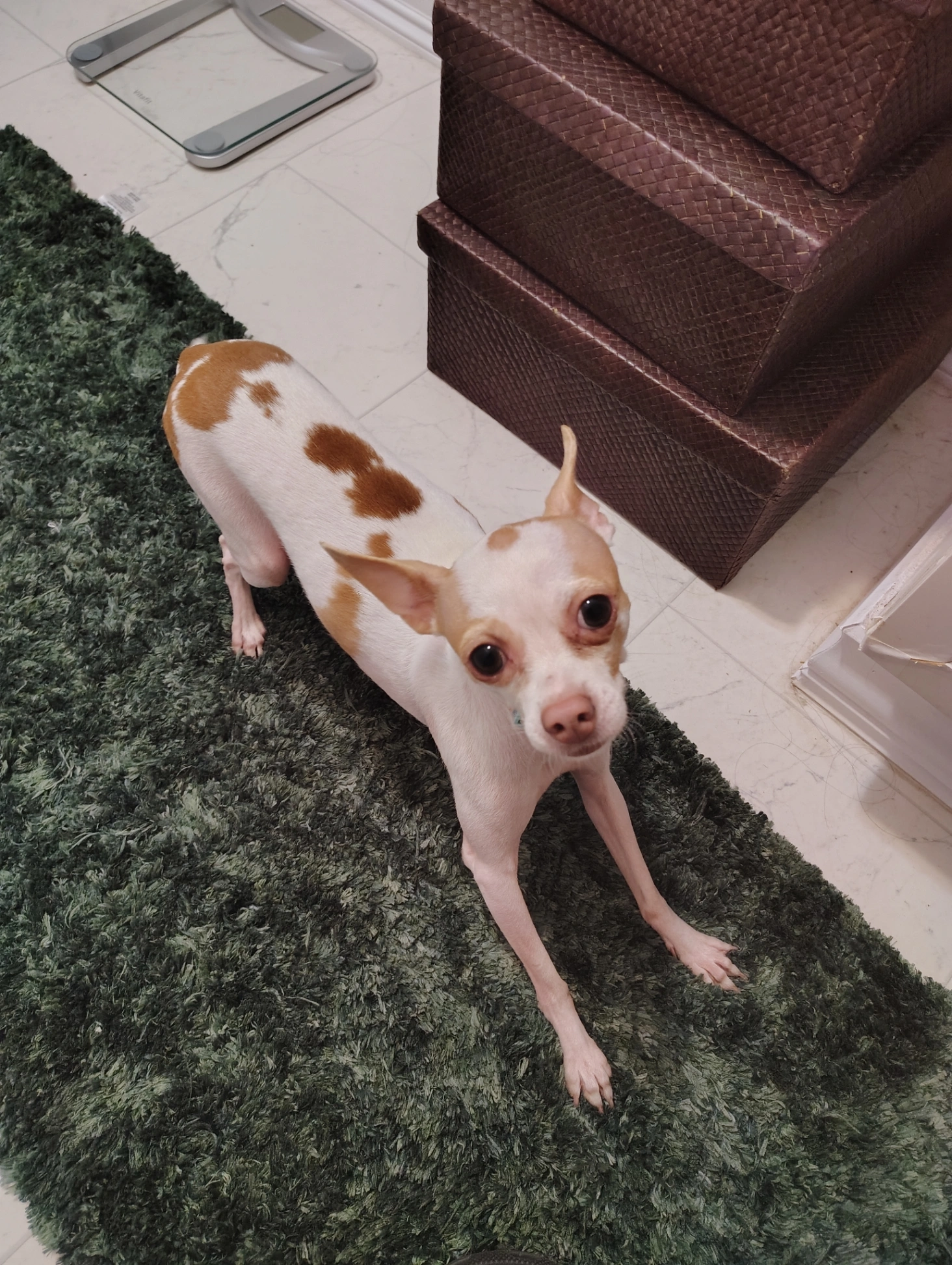 Joey is a toy Chihuahua she doesn’t really bark. She’s very good and quiet. She’s potty trained she’s beige and white and she has a white line right across her head. She is micro chipped. I did that in San Antonio in 2019 by the Company 24 hour pet watch she weighs maybe three or 4 pounds she 6 1/2 years old her birthday is coming up in June when she runs she runs sideways and she’s skinny and she doesn’t do bad. She’s very good. She’s a picky eater and she got a piggy little tail. She gets ear aches real bad