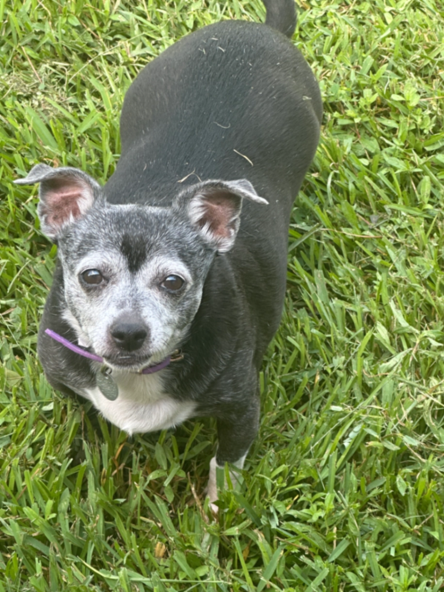 She is a 13yr old chihuahua/terrier mix. Mostly black with white fur on her paws, face and belly. She was last seen on the corner of 41st and Main street in a darlk purple collar with gold stars and a silver outdated tag, a pink hoodie that says “favorite child” with a lavender harness on top.