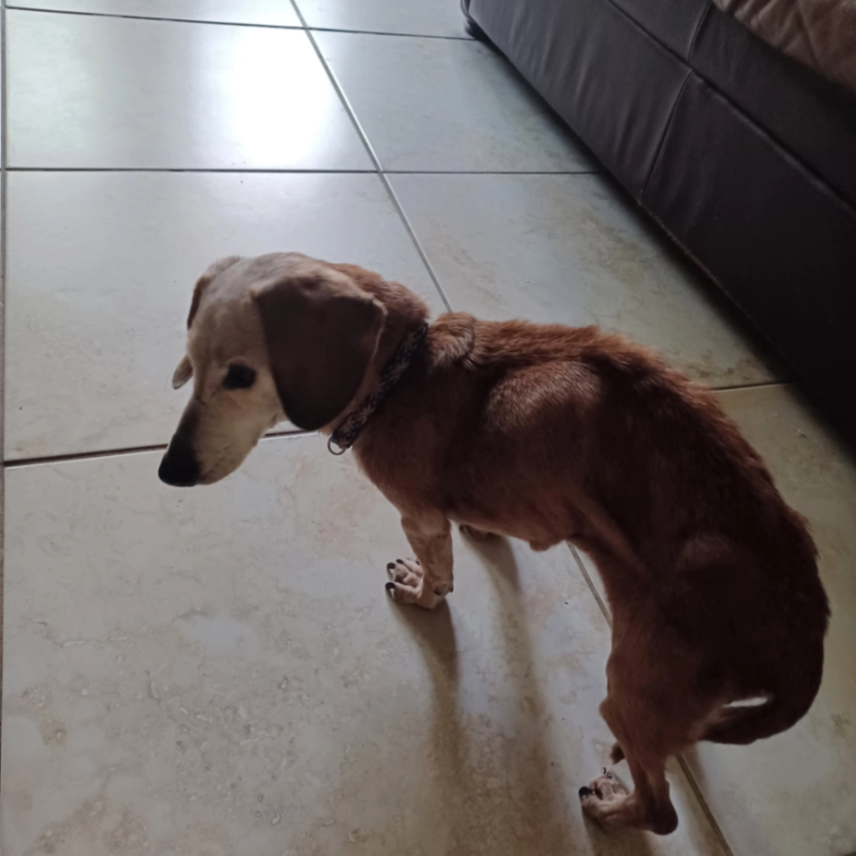 Light brown Dachshund with signs of aging, a white snout and head, and fragile.